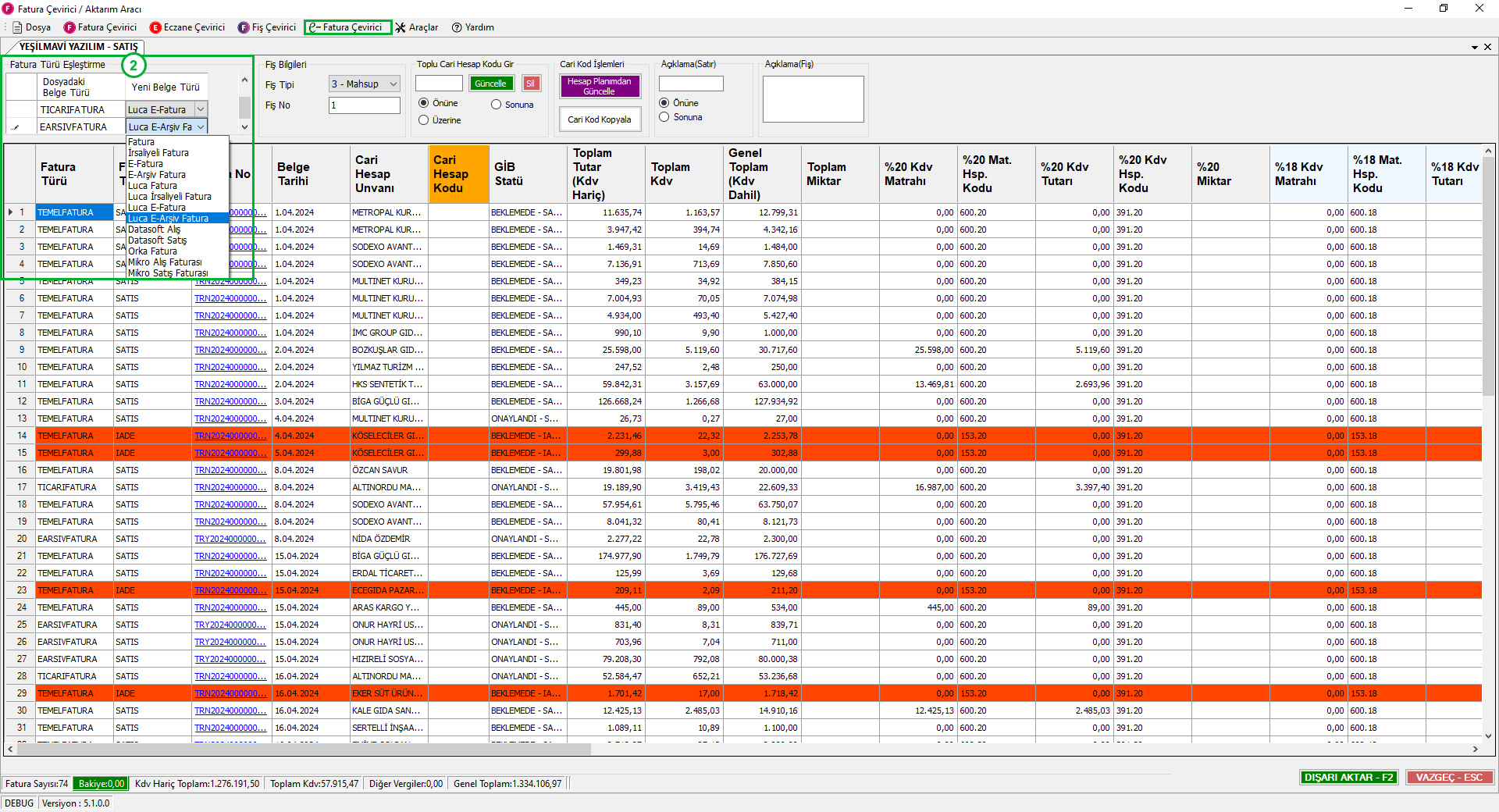 Fatura Türü Eşleştirme : Muhasebe fişinin oluşmasın esnasında kullanılacak Fatura Türü, Belge Türü ve Belge Tipi olarak adlandırılan içerik seçiminin yapıldığı bölüm. Resimde Dosyadaki Belge Türü (E-Fatura) olarak gözükmektedir. Bu içerik yerine belirleyeceğimiz bir türün gitmesi için Yeni Belge Türü kısmınından içerik seçiniz. Buradaki içerikler görmek Yeni Belge Türünün altında yer alan ok işaretine tıklayınız. Örnek seçim için E-Fatura görünen faturanın karşısına Luca E-Fatura seçimi yapılarak Luca tarafına EF kodunun aktarılması sağlanacaktır.