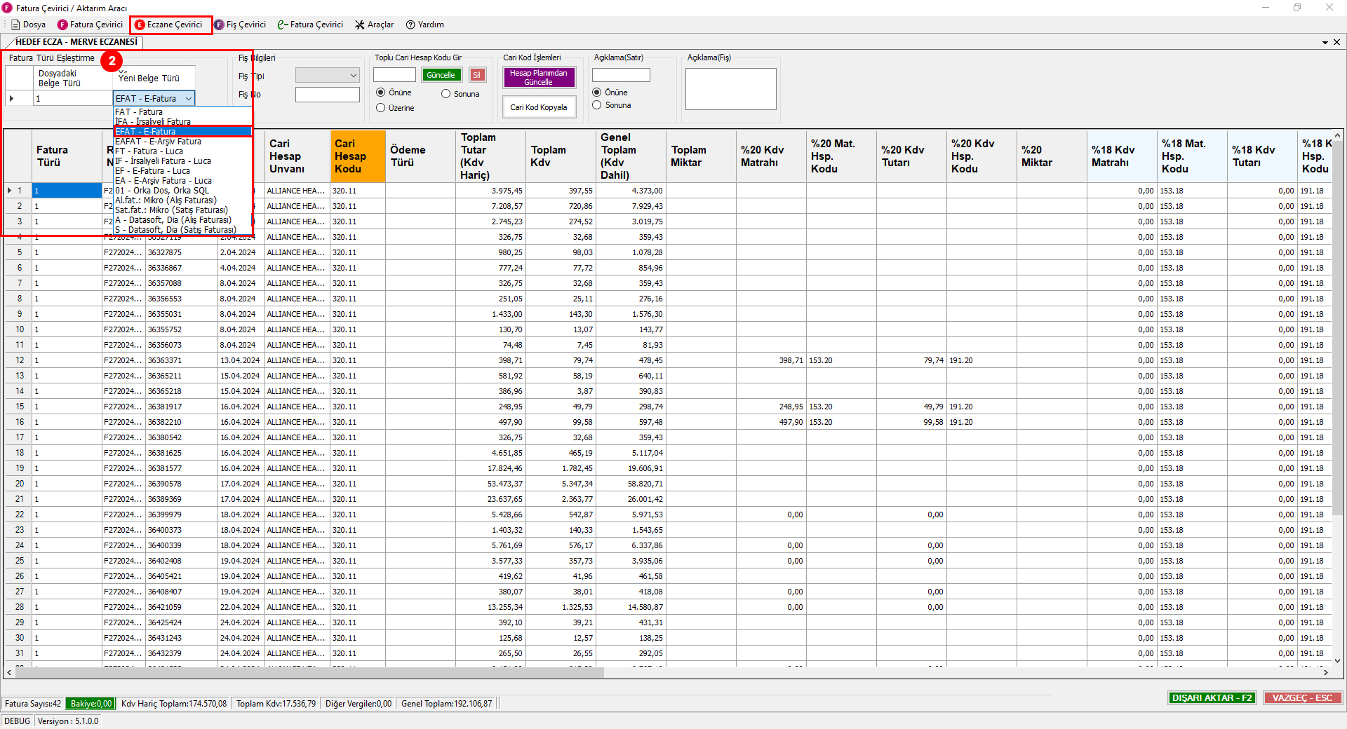 Fatura Türü Eşleştirme : Muhasebe fişinin oluşmasın esnasında kullanılacak Fatura Türü, Belge Türü ve Belge Tipi olarak adlandırılan içerik seçiminin yapıldığı bölüm. Resimde Dosyadaki Belge Türü (E-Fatura) olarak gözükmektedir. Bu içerik yerine belirleyeceğimiz bir türün gitmesi için Yeni Belge Türü kısmınından içerik seçiniz. Buradaki içerikler görmek Yeni Belge Türünün altında yer alan ok işaretine tıklayınız. Örnek seçim için E-Fatura görünen faturanın karşısına EFAT Gms.Net - Altos (Online) tarafına EFAT kodunun aktarılması sağlanacaktır.