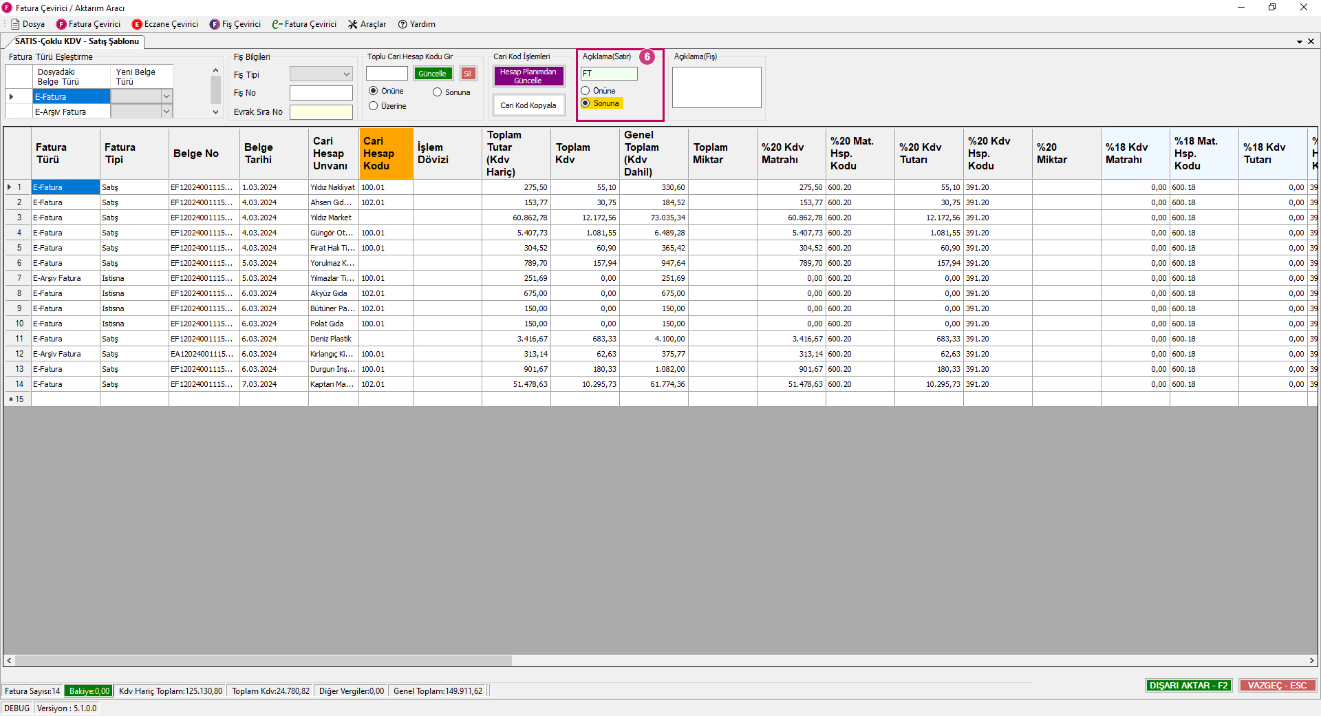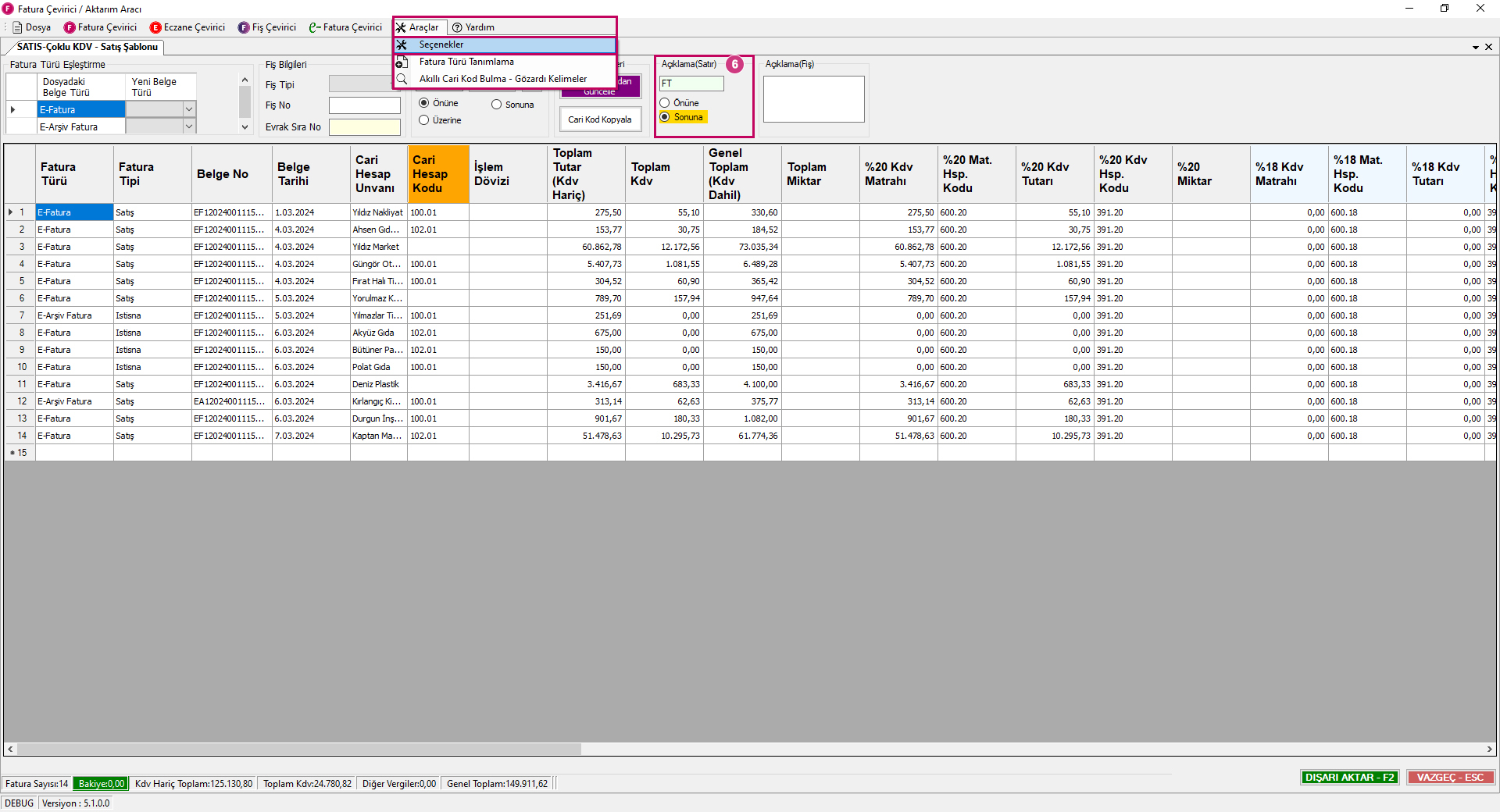 Açıklama (Satır) Önüne : Örnekte 2015 yazılan değer satır açıklamasında 2015 - Yıldız Nakliyat - 220813 - 02.01.2015 şeklinde muhasebe fişinde gözükecektir. Bu dizilimi Araçlar > Seçenekler > Aktarım Seçenekleri - 1 pencereinde bulunan Fiş Satır Açıklaması bölümünden kontrol edebilirsiniz.